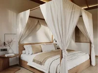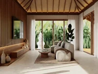 Interiors are designed for effortless tropical living with a fluid layout that unites living, dining and sleeping zones beneath high wooden‑beamed ceilings. Light stone floors and large glass windows with sheer white curtains fill the space with natural light and frame lush greenery outside. The living room features a light‑coloured L‑shaped sofa and round wooden coffee table; the dining area is anchored by a solid wooden table with four white upholstered chairs and woven pendant lights. The bedroom is appointed with a wooden four‑poster bed draped in light fabric, natural‑fibre rugs and ambient ceiling lighting; the bathroom continues the natural palette with light stone tiles, a freestanding tub beside a window and a glass shower with rainfall head.