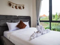 Upstairs, both bedrooms are bathed in natural light, with oversized windows that frame ricefield views—a rare bonus at this price point. The shared bathroom includes a rain shower and single sink, and there’s a convenient guest toilet on the lower level. Every space is designed for comfort, with a layout that feels practical, intimate, and easy to maintain.