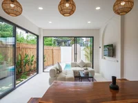 Completed in 2025, the two-storey villa sits on 94 sqm of land with 115 sqm of well-utilized interior space. Designed for simplicity and ease, the layout features an enclosed living and dining area that flows into a fully equipped kitchen, offering a cozy yet modern environment ideal for couples or small families. Large sliding glass doors open to a private rectangular pool (approx. 3 x 2 meters), framed by tropical plants and bamboo fencing—bringing indoor-outdoor harmony into a compact footprint.