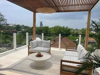 The master suite is a true retreat, spanning an impressive 32 sqm. With a king-size bed, a private lounge area, a flat-screen TV, and an ensuite boasting a walk-in shower, double basins, and a luxurious stone bathtub, it exudes a five-star experience. Upstairs, three additional bedrooms—two with ensuite bathrooms—provide ample space for family or visiting friends. The first-floor balcony terrace is perfect for evening cocktails, offering spectacular sunset views over the Bukit Peninsula.