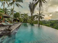 The living and dining areas of this west facing estate can be found in a beautifully carved teak wood Joglo overlooking the 12m x 5m infinity pool and the valley and jungle views beyond. The property has 4 private ensuite cottage suites – each offering a distinctive ambience. One of the cottages is a rare heritage gladak, exquisitely updated for contemporary comfort. Originally built in 1863, its sturdy teak walls and hand-tooled beams were once the foundation of a Balinese home. Another cottage suite is an airy abode beautifully accented with hand-carved teak. Soft lights draw your gaze upward to vaulted rafters inspired by the traditional Balinese home.