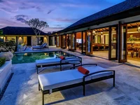 The villa has an elegantly furnished yet comfortable living room and a dining table long enough for 12. The kitchen is modern and fully equipped and also includes a wet kitchen. On the lower level of the villa, an entire space is dedicated to entertaining where you can find a pool table, service bar and another long dining table all facing the pool with water cascading from the main one on top. There is also a garden gazebo nestled within the lush garden. Staff quarters include a kitchen, office, storage rooms and a bedroom with its own bathroom. The villa has a 2-car enclosed garage and comes fully furnished.