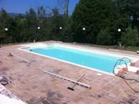 Bauernhaus im Jahr 2004 renoviert bestehend aus drei Wohneinheiten für ca. 200 m2 Sieben Schlafzimmer und sieben Badezimmer Sauna Dienstleistungen mit Küchenzeile Stein- und Ziegelkonstruktion 10.000 m2 Garten Schwimmbad LPG-Heizung Panoramablick Sibillini Center 3 km entfernt