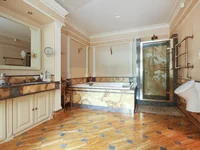Badezimmer und Toiletten sind mit seltenen Arten von Marmor, Travertin und Onyx dekoriert. Sanitär Vileroy & Boch. Autonome Gasheizung und Wasserversorgung, Fußbodenheizung und Wasserfiltration.