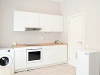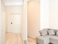 Available: sofa bed, laminate flooring, household appliances (stove, refrigerator, washing machine, oven).