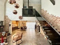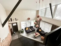 - Large living room with kitchen and fireplace, office, entrance hall with built-in wardrobe. Due to the panoramic windows the house is enriched with natural light.