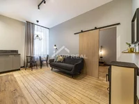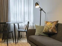 The apartment is equipped with all necessary furniture and appliances. It is decorated in a modern style using natural, high-quality finishing materials. Restored wooden floors and doors.