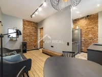 For sale modern apartment in renovated building in the center of Riga. The apartment with fireplace has spacious hall combined with kitchen-dining room, one isolated bedroom.