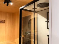 Im Erdgeschoss geräumiges Wohnzimmer mit Küche und Essbereich, Sauna, Garage, Außenterrasse, kleiner Keller mit Schrank, Bad, Kesselraum.