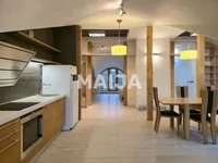 Badezimmer mit Fenstern. Das Wohnzimmer ist mit der Küche verbunden, die mit einem großen Esstisch für festliche Abendessen kombiniert wird.