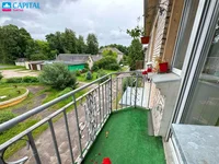 strategisch bequeme und attraktive Dreizimmerwohnung in Kaunas, Ekskavatorinkų g. 8, Petrašiūnai microdistrict mit Möbeln und Haushaltsgeräten im zweiten Stock eines zweistöckigen Holzhauses.