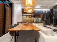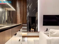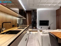 Exklusive, Designer entworfen und implementiert Innenraum, funktionelle Lösungen, Möbel hergestellt, um zu bestellen; Qualität haltbare Materialien - Holz, Stein; eine gemütliche solide Atmosphäre wird von reichen Tönen von Erdfarben, Bio-Kamin, Beleuchtung von verschiedenen Bereichen geschaffen.