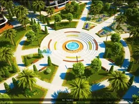 Die angrenzenden Gebiete sind angelegt, vor dem Gebäude befindet sich ein Park mit einem Brunnen und einem großen modernen Spielplatz.