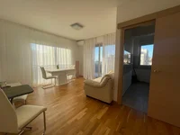 Die Wohnung befindet sich im vierten Stock eines neu gebauten Gebäudes und bietet einen Blick auf die Berge und die Stadt.