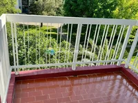 Ein angenehmer Blick von den Fenstern - viel Grün im Hof, im Winter ist es warm, es gibt keine Schimmel. Manicured Eingang.