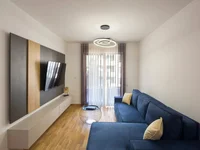 Wir bieten eine 55 Quadratmeter große Zwei-Zimmer-Wohnung in Becici zum Verkauf an. Die Wohnung besteht aus einem Wohnzimmer mit Küche und Küchenbereich, zwei Schlafzimmern, einem Badezimmer und einer Terrasse mit Blick auf die Berge.