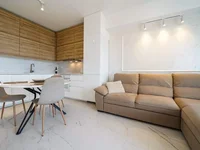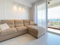 Die Wohnung besteht aus einem separaten Flur, einem Wohnzimmer kombiniert mit einer Küche, die zu einer Terrasse mit Panoramablick auf das Meer, zwei Schlafzimmer (jeweils mit Zugang zur Terrasse) und zwei Badezimmern öffnet.