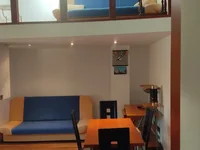 Das Badezimmer ist modern ausgestattet, und ein besonderer Charme der Wohnung ist die Galerie, wo das Bett liegt, bietet zusätzlichen Platz für Ruhe und Privatsphäre.