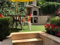 Vor der Haustür sind Barbeque, Nebel, Grün, Blumen zu sehen.