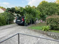 Der gepflegte Hof umfasst Parkplätze, einen Obstgarten und ein ordentlich eingezäuntes Grundstück. Die Tore haben separate Eingänge für Autos und Fußgänger. Das Haus ist bezugsfertig, mit frisch gestrichener Außenfassade, neu erneuertem Dach und Klimaanlage.