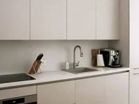 Italienische Küche mit Einbaugeräten: Geschirrspüler, Kühlschrank, Backofen, Herd, Kaffeemaschine.