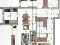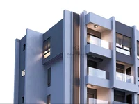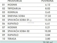 Die Wohnung hat eine Fläche von 79,9 m². Fenster auf drei Seiten, zwei mit Aussicht: Südwesten zum Meer und Nordwesten zu den Bergen. Raumaufteilung: Wohn- und Esszimmer 25 m² mit Panoramaschiebetür und Zugang zur Terrasse; separate kompakte Küche mit Fenster; zwei Schlafzimmer — kleineres 13,5 m² und Hauptschlafzimmer 15 m² mit Kleiderschrank, eigenem Bad und Panoramafenster; geräumiges Gemeinschaftsbad 6,6 m². Die Wohnung wird mit hochwertiger Endausstattung geliefert. Badezimmer komplett fertiggestellt und mit Sanitäranlagen und Boilern ausgestattet. Böden: großformatiges helles Feinsteinzeug. Inverter-Klimaanlagen in allen Räumen. Warme Aluminiumfenster mit Dreifachverglasung und elektrischen Rollläden. Hochwertige Sicherheitseingangstür mit Riegelverschlüssen. Glasgeländer auf den Terrassen. Gebäude von außen isoliert. Zwei Wohnungen pro Etage.
