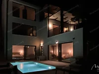 Level 1 umfasst zwei Schlafzimmer. Einer von ihnen ist ein Hauptschlafzimmer mit eigenem Bad und Ankleideraum, die einen Ausgang und einen Blick auf den Pool hat. Das zweite Schlafzimmer ist auch mit einem Ankleideraum und Zugang zum Pool ausgestattet. Es gibt auch eine Gästetoilette mit Dusche, einen geräumigen Korridor und ein technisches Zimmer mit einer Zone zum Waschen und Bügeln.