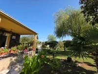 Between the two houses is an orchard with various types of fruit trees and an underground drip irrigation system. The entire estate is enclosed by a stone wall and decorative wrought iron fence, and all buildings are connected by stone paths. A garage for two cars and a paved yard add to the functionality. The auxiliary building of ___ m² serves as a storage room.
