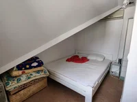 Eine gemütliche Duplex-Wohnung mit funktionalem Layout: Schlafzimmer, Küche, Wohnzimmer, Badezimmer.