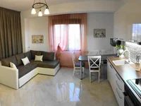 Die Terrasse bietet einen schönen Blick auf das Meer und die Berge. Im Wohnbereich gibt es einen Tisch mit Stühlen und ein Eck-Falz-Sofa. So können 4 Personen in der Wohnung leben.
