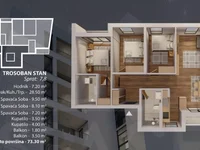 Na prodaju jedinstven trosoban stan u Baru!Stan je ukupne kvadrature 73.3m2 i nalazi se na osmom spratu novoizgradjene zgrade ciji je rok zavrsetka radova kroz mjesec dana.Iz stana koji je udaljen svega 630m2 od plaze, pruza se panoramski pogled na more i grad Bar!Izuzetno je osuncan i idealan za zivot ali i za investiciju!Zgrada je radjena od najkvalitetnijih materijala. Termo blokovi su debljine 25cm, dok je izolacija ukupne debljine 10cm!U prizemlju zgrade nalaze se poslovni prostori, a odmah preko puta zgrade je najveci projekat sa trznim centrom u Baru!Mogucnost kupovine garaze po cijeni od 15.000E!