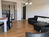 The apartment features two bedrooms, a bathroom with a bathtub, and a spacious living room/kitchen. The living room and bedroom open onto a balcony with a seating area. This bright and cozy apartment is fully equipped with all necessary appliances and furniture. Air conditioning is installed, and internet and satellite TV are available.