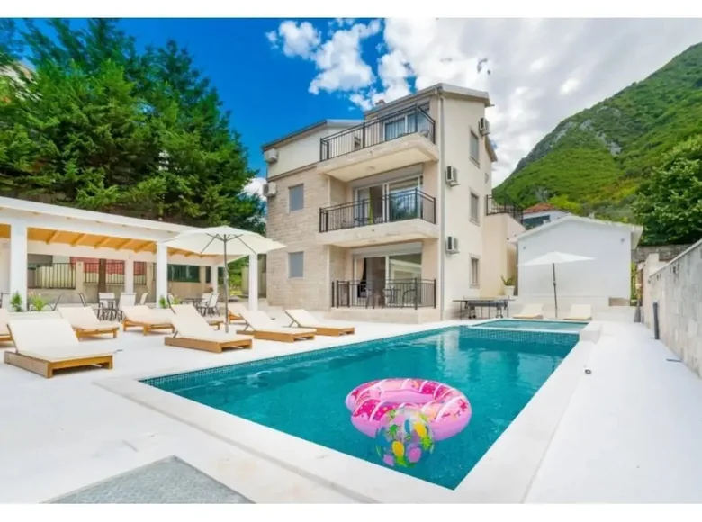 Im ersten Stock bietet die Villa einen offenen Meerblick und einen teilweisen Blick auf die Bucht von Kotor. Hochwertige Materialien wurden im Bau verwendet – die Etagen in den Schlafzimmern sind aus Eichenparkett, während die Treppen und Böden im Wohnzimmer mit verarbeitetem Stein fertiggestellt sind. Jedes Zimmer ist klimatisiert und die Unterkunft verfügt zudem über einen Kamin, eine Zentralheizung und einen Zentralkessel. Parkplätze stehen für drei oder mehr Autos zur Verfügung.