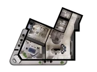 Layout: Küche kombiniert mit Wohnzimmer, 2 Schlafzimmer, Flur, 2 Bäder und 3 geräumige Terrassen