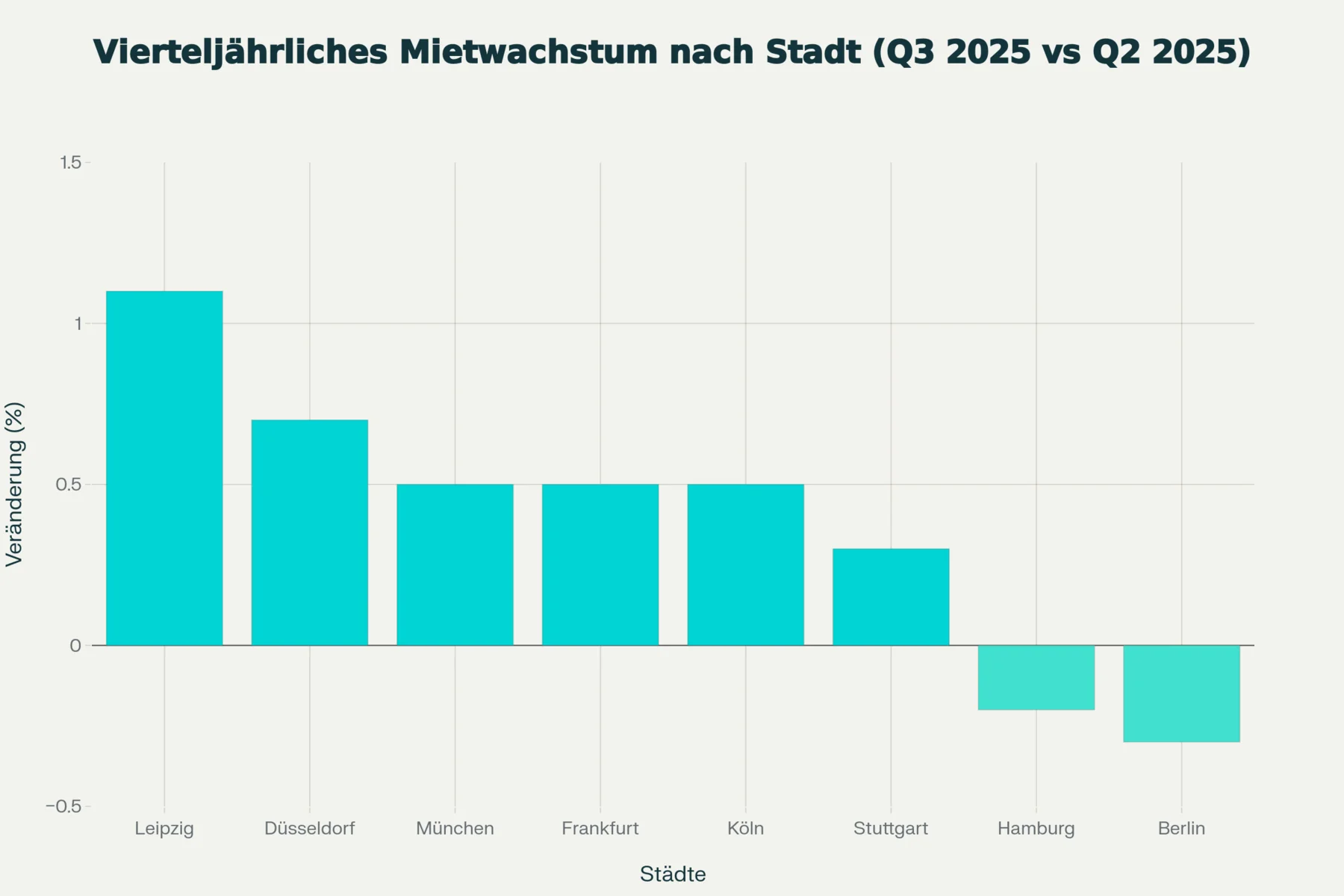 - Preisanstieg in ostdeutschen Städten: Leipzig und Düsseldorf zeigen ein quartalsweises Wachstum von 0,7–1,1 %. Gleichzeitig sinkt oder bleibt die Miete in Berlin und Hamburg stabil.