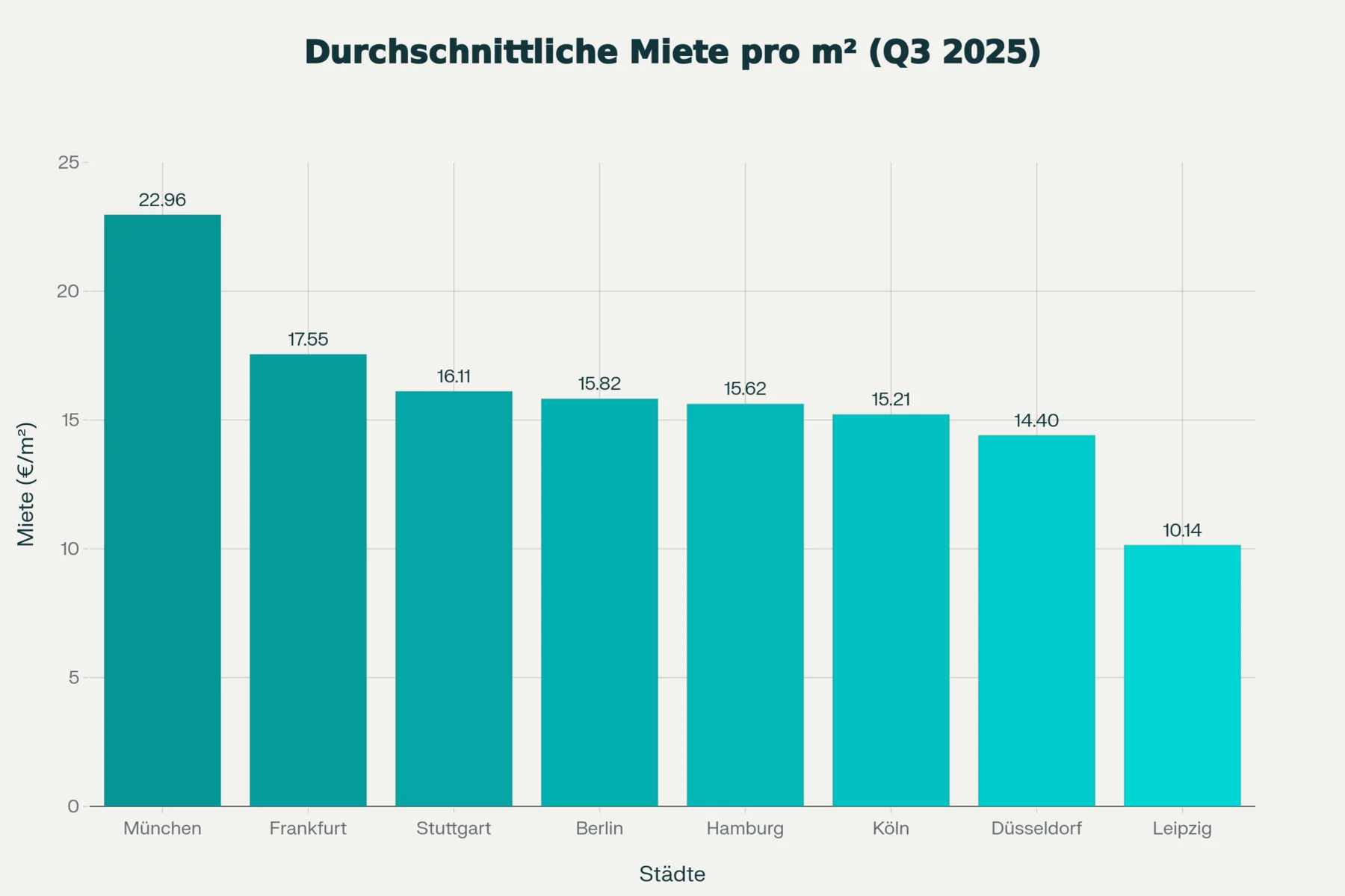 Diese Daten basieren auf dem Mietpreisindex von GREIX für das dritte Quartal 2025 sowie auf Untersuchungen der Firmen InvestRopa, Cushman & Wakefield, JLL und anderen maßgeblichen deutschen Quellen.