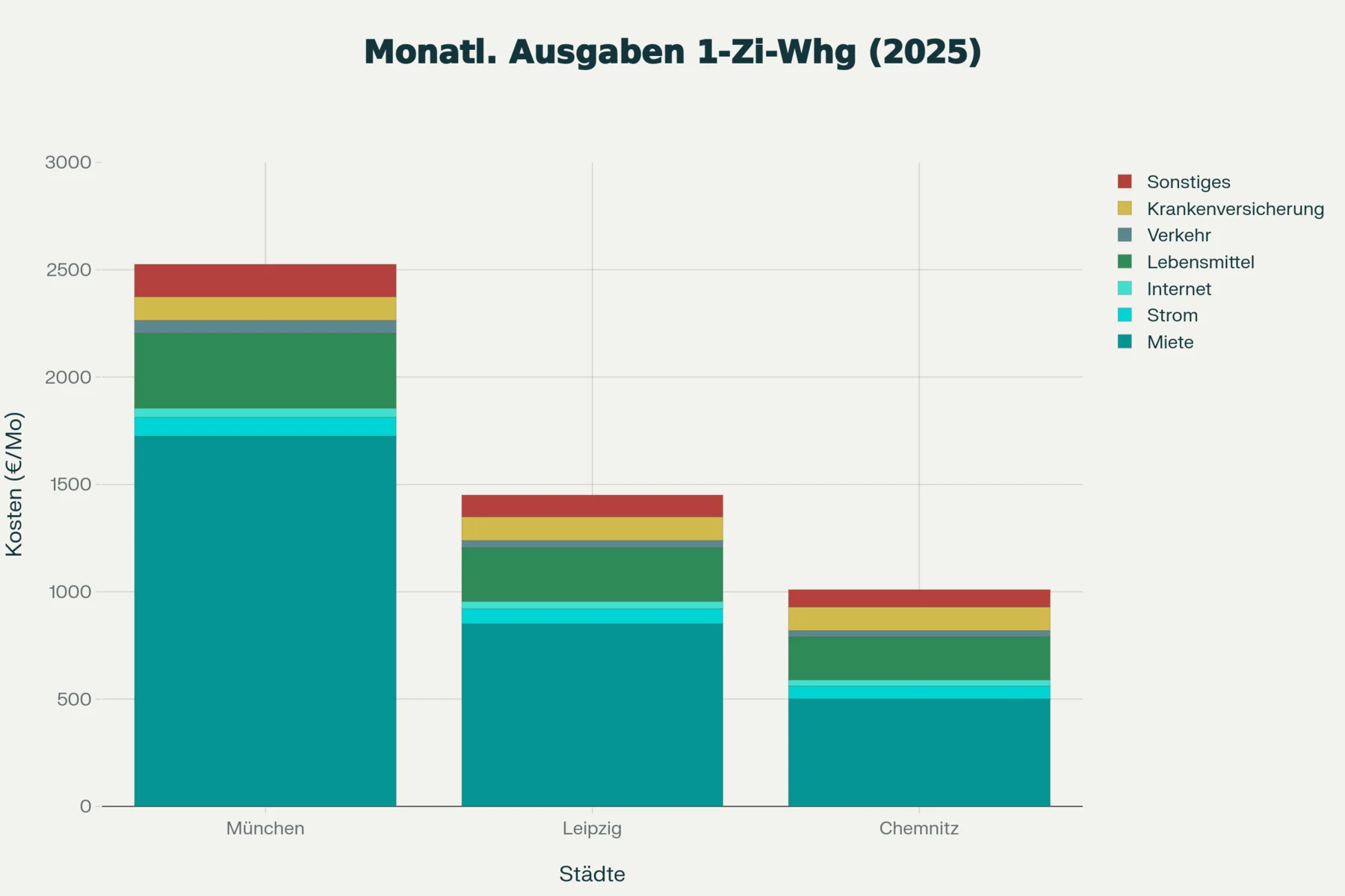 Beispiel: monatliche Wohnkosten in München (1854 €) sind etwa 3,1-mal höher als in Chemnitz (590 €). Und ein Umzug von München nach Leipzig kann jährlich 18.168 € sparen bei vergleichbarem Lebensstil.