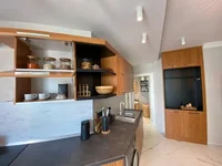 Das Wohnzimmer ist mit Küche und Essbereich kombiniert. Die Küche verfügt über Haushaltsgeräte: Kühlschrank, Herd, Backofen, Haube und Waschmaschine. Gemütliches Schlafzimmer mit Designer-Innenraum, Bett und Einbauschrank.