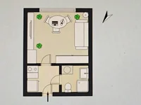 Fläche: 20 m2 (Zimmer: 13,5 m2, Badezimmer: 2,5 m2, Flur mit Kochnische: 4 m2)