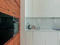 Es gibt ein Schlafzimmer auf der rechten Seite der Wohnung. Es gibt einen großen Komplex von Kleiderschränken, die die Oberfläche der gesamten Wand einnimmt. Darüber hinaus ein großes Doppelbett. Der Boden in diesem Zimmer ist mit einer Eichenplanke bedeckt.