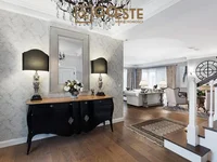 Auf dem Boden gibt es repräsentative Treppen, und Aufmerksamkeit wird auf eine monumentale Wand mit Sandstein gesäumt, die den stilvollen Charakter des Innenraums betont.