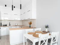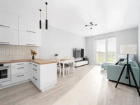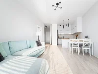 Das Wohnzimmer ist mit einem Essbereich und einer Küche mit Einbaumöbeln und Geräten ausgestattet: Kühlschrank, Induktionskochfeld, Backofen, Geschirrspüler und Kapuze. Das Schlafzimmer von ca. 15 m2 mit westlicher Belichtung, mit einem großen Doppelbett, einer Kommode und einem Einbauschrank. Das Badezimmer von 4,85 m2 verfügt über eine begehbare Dusche, ein Waschbecken mit Schränken, eine Waschmaschine und ein WC mit einer Installation. Der Flur von 4,42 m2 hat auch einen geräumigen Kleiderschrank.
