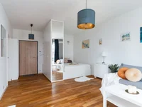 Zum Verkauf eine voll möblierte und stilvolle Studio-Wohnung von 34,62 m2 mit einem privaten 34 m2 Garten, befindet sich im Erdgeschoss einer ruhigen, bewachten und überwachten Wohnanlage auf st. Worcella in Warschau. Die Fenster und der Garten stehen vor dem Innenhof und sorgen für Ruhe und Privatsphäre.