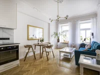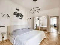 • District heating, plus underfloor heating in the bathroom and hallway • Bedroom features: new lacquered “champagne” herringbone parquet, beige bouclé upholstered 200×180 cm bed with a memory foam mattress from Westwing, marble bedside tables, a spacious cashmere-colored wardrobe with hanging rail, and smart bulbs controllable via app • Bathroom: Hansgrohe fittings (faucet and shower), Grohe installation frame, Rocaceramics, linear drain, and custom cabinetry with quartz composite countertop • Custom-made kitchen with a quartz composite countertop, gold handles, granite under-mount sink with pull-out faucet