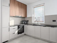 • Spacious living room with a custom-made kitchen, equipped with modern household appliances: dishwasher, oven, induction hob, hood, and fridge with freezer.