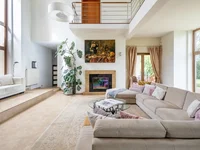• Repräsentatives Wohnzimmer mit Kamin und Panoramafenstern