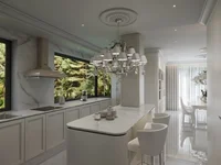 Offene, moderne Küche mit einer Insel und einer funktionellen Speisekammer.