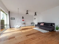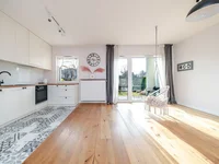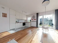 Wir präsentieren eine komfortable 2-Zimmer-Wohnung mit einer Fläche von 51,4 m2, mit einem geräumigen privaten Garten und Terrasse. Das Apartment befindet sich im Erdgeschoss eines modernen Gebäudes von 2019, entwickelt von Napollo. Dank der Südwestausrichtung der Fenster ist das Interieur schön beleuchtet, und große Verglasung führt direkt zur Terrasse und zum Garten, wodurch ein idealer Raum für Entspannung geschaffen wird.