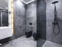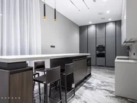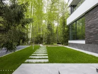 country house 706 m ² Built on spacious Primesnaya plot of 20 acres. The facade with a large area of glazing is lined with decorative selikata-selikono plaster, facade planking from heat-treated larch, artificial stone Leonardo Stone and porcelain granite on base.
