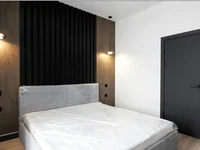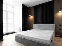 Im Hauptschlafzimmer, dekoriert mit Holzplatten mit kontrastierenden stilvollen Latten, ist bereits ein Bett mit einer orthopädischen Matratze installiert. Die Basis und das Headboard ist ein Samt Velour. Bei der Ausstattung von Badezimmern wurden natürliche Texturen für Beton, Holz, Chrom verwendet.
